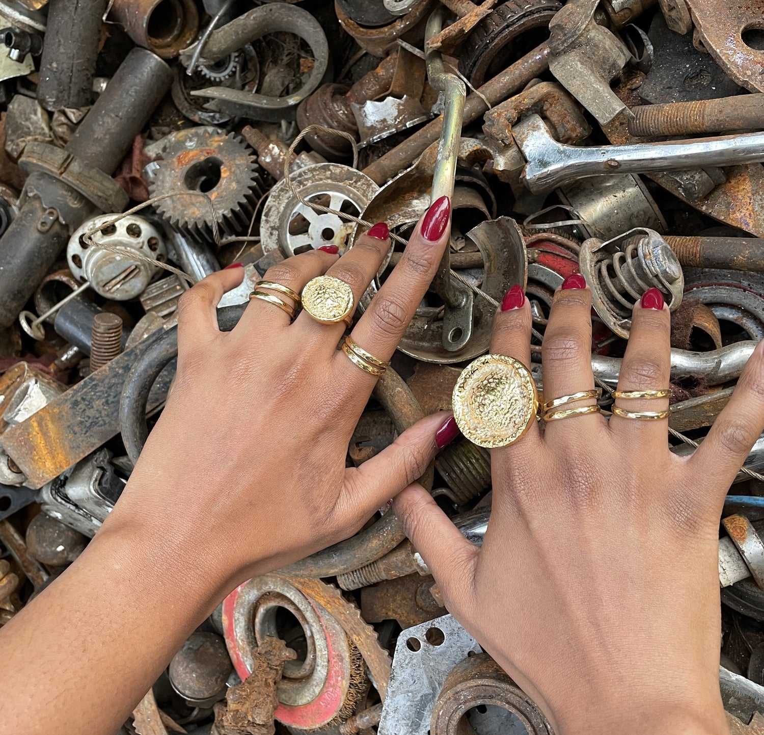 Each piece of our jewelry is crafted from responsibly sourced materials like recycled brass which reflects our dedication to sustainability and mindful crafting.